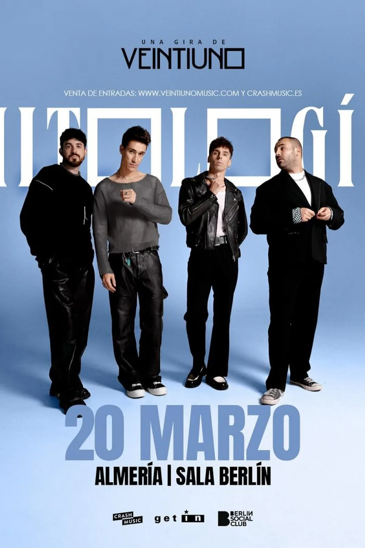 VEINTIUNO es una banda de Toledo que fusiona rock con influencias de R/B y soul , creando un universo lírico muy personal . Debutaron con su primer disco, "Nada Parecido" en 2015 , tras haber lanzado dos EPs. Este álbum fue grabado de forma independiente gracias a un crowdfunding que superó los 3,900 euros en menos de 24 horas. Fue producido en Q-Studios (Madrid) por Jimmy Summers y mezclado por Guillermo Quero . La presentación de "Nada Parecido" llevó a la banda a hacer sold-out dos noches seguidas en Madrid y les permitió recorrer casi veinte ciudades de España, participando en festivales como Alhambra Sound , Sansan Festival , Estaciones Sonoras y Arenal Sound . Además, compartieron escenario con grupos como Dorian , Miss Caffeina y Sidecars . Tras varios años de éxito continuo, VEINTIUNO lanzó en octubre de 2023 su cuarto álbum de estudio, "El arte de perder" , que presentaron en más de una decena de festivales durante el verano. Ahora, los integrantes Diego, Pepe, Yago y Rafa se embarcan en una nueva etapa con la gira "MITOLOGÍA" , cuya primera parada será el 29 de mayo en La Riviera de Madrid . Desde su debut, la banda ha crecido constantemente, logrando entradas agotadas en salas y ganando reconocimiento en macro-eventos. Han colaborado con artistas como Love Of Lesbian , Enol y Chica Sobresalto , consolidándose como una de las bandas referentes del indie, rock y pop en español gracias a su honesto discurso sobre la amistad y la perseverancia .