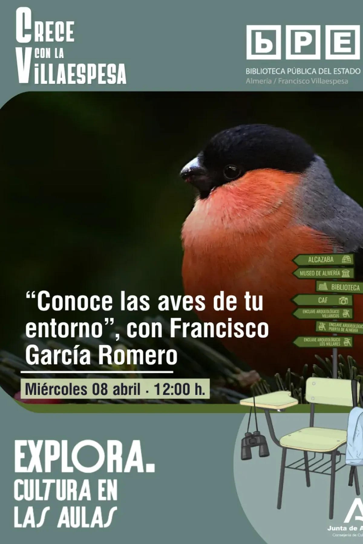 Crece con la Villaespesa. "¿Conoces las aves de tu entorno?", con Francisco García Romero. A través de la presentación de diapositivas en las que se darán a conocer características y algunos de los aspectos más curiosos de las aves que conviven con nosotros/as, se iniciará un diálogo con el alumnado con el objetivo de que conozcan las aves que ven en su día a día, sensibilizar sobre la importancia de la conservación de las aves de nuestro entorno y despertar el interés en el alumnado sobre el mundo de las aves en libertad. Miércoles 8 de abril 12:00h. Salón de actos. Actividad concertada con centros educativos.
