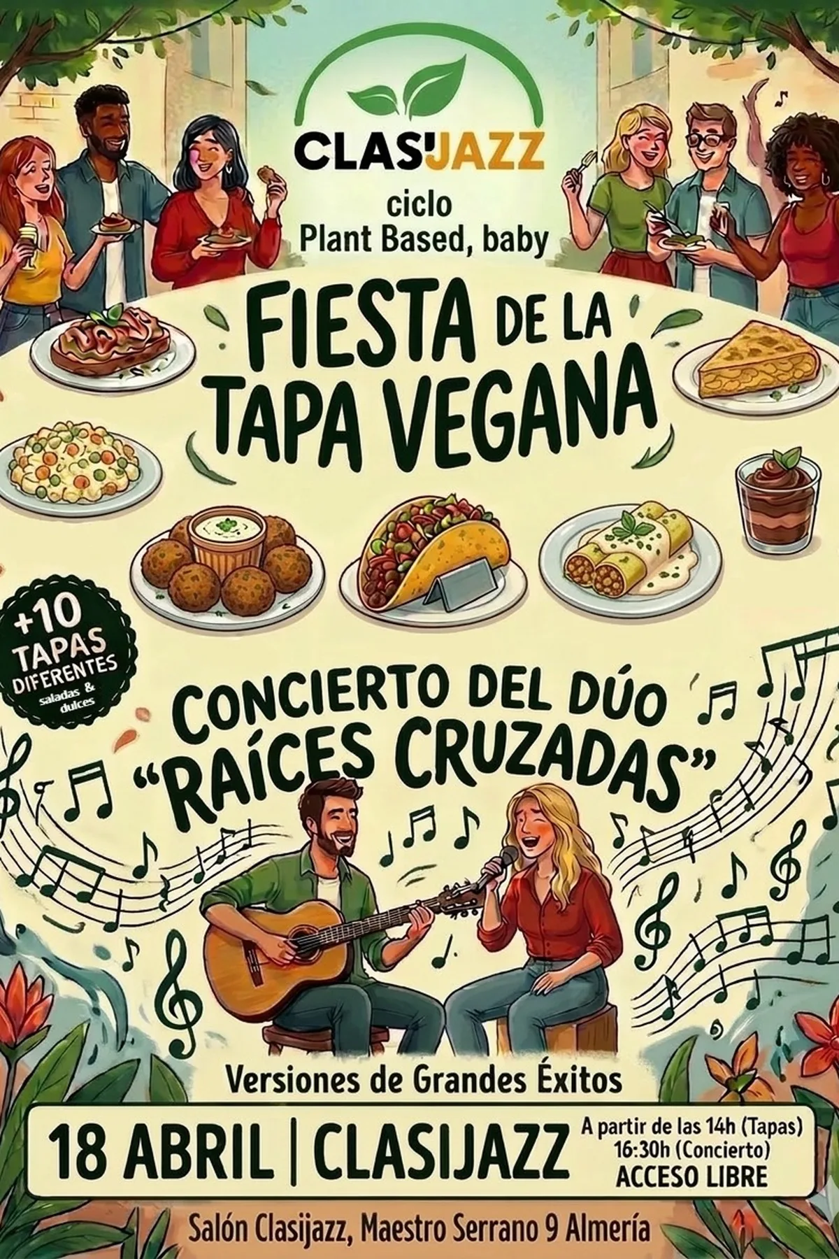 Fiesta de la Tapa Vegana en Clasijazz En esta nueva cita del ciclo “Plant Based, baby” el buen ambiente, la cocina vegetal y la música se mezclarán sin prejuicios y con mucho sabor. El próximo 18 de abril, nuestro equipo de cocina, junto a Yolanda Granados (presidenta de la Asociación de Veganos de Almería), nos sorprenderán con una magnífica selección de exquisitas tapas* caseras, creativas y llenas de amor, creadas exclusivamente para nuestro disfrute. Y después llegará la música. El dúo “Raíces Cruzadas” pondrá la banda sonora a la tarde con versiones de grandes éxitos del pop. Un concierto cercano que invitará a cantar y dejarse llevar. Clasijazz es encuentro, cultura y cercanía. Y este evento será justo eso: una excusa perfecta para venir con amigos, conocer gente, descubrir nuevos sabores y disfrutar de una experiencia diferente. Entrada libre. Sin reservas. Solo tienes que venir. *Más de 10 tapas diferentes, tanto de cortesía con la bebida, como especiales con pago extra. Habrá también tapas dulces.