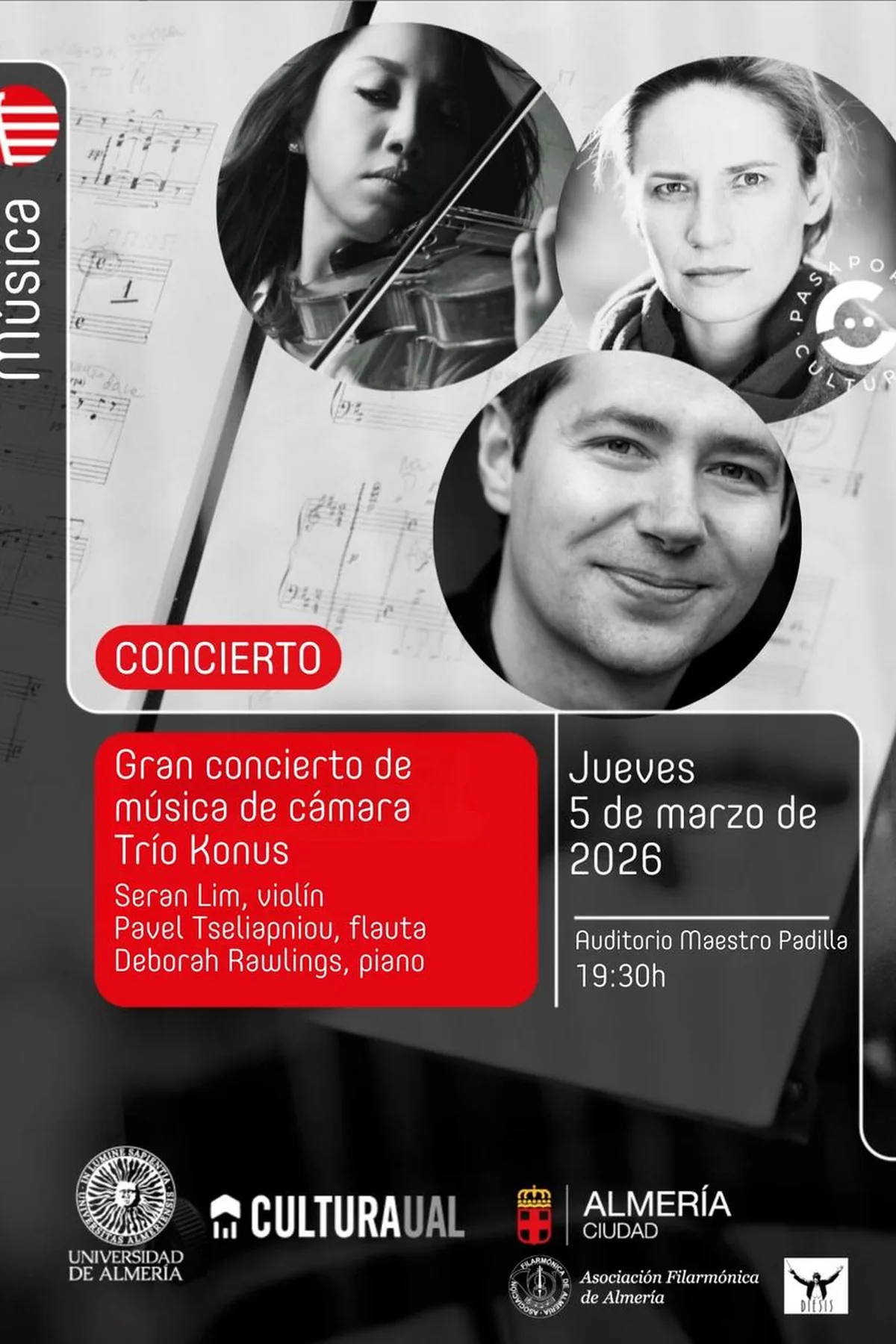 Disfruta de una magnífica velada musical con el Trío Konus en un gran concierto de música de cámara. El evento contará con la destacada participación de Seran Lim al violín, Pavel Tseliapniou en la flauta y Deborah Rawlings al piano. Esta especial combinación de instrumentos promete una experiencia sonora única y sofisticada. Organizado por la Universidad de Almería y la Asociación Filarmónica de Almería, este evento forma parte del Pasaporte Cultural. ¡Una cita ineludible para los amantes de la música clásica!
