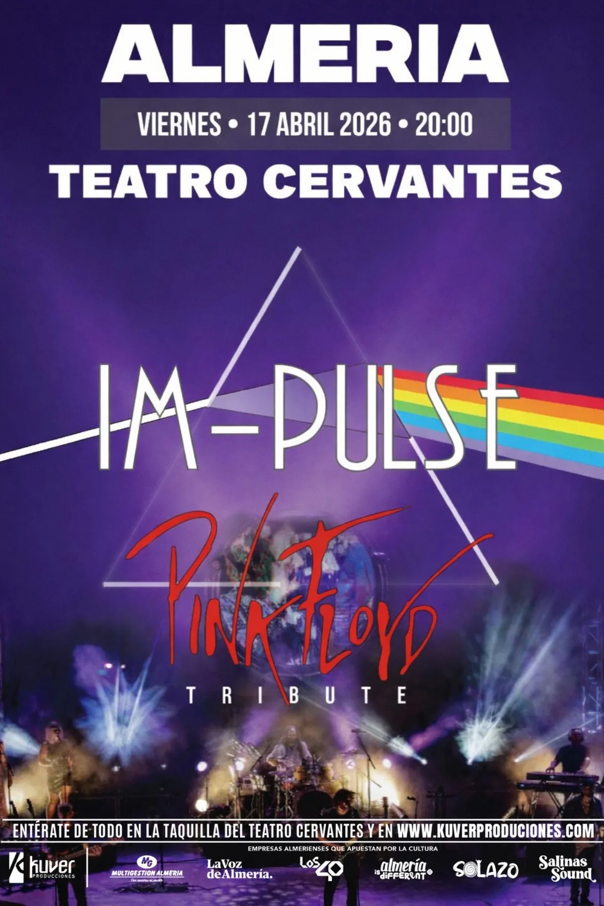 IM-PULSE es la mejor banda tributo a Pink Floyd del país. Con un excelente directo y una espectacular puesta en escena, han logrado convertirse en todo un referente, siendo considerados el mejor homenaje a la mítica banda británica, según la opinión de miles de personas que han asistido ya a sus conciertos. Con un impresionante espectáculo de imágenes, luz y sonido minuciosamente elaborado consiguen cautivar al público recreando la particular atmósfera de los conciertos de esta gran banda, una de las más representativas del rock progresivo de todos los tiempos. Durante más de dos horas y media interpretan, con toda fidelidad, un repertorio con los temas más emblemáticos de Pink Floyd basándose, sobre todo, en el icónico directo P-U-L-S-E, pero sin...Leer más
