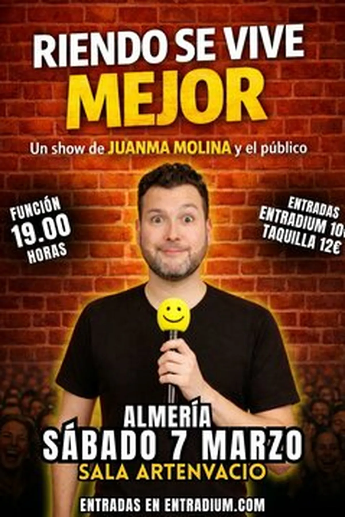 STAND UP COMEDY ARTENVACIO - JUANMA MOLINA" Riendo se vive mejor" es un espectáculo de comedia en el que Juanma Molina conecta con el público a través del humor cotidiano, la improvisación y la cercanía. Durante una hora, el cómico comparte anécdotas, observa situaciones familiares y nos recuerda que, pese a todo, siempre es mejor reír. El público asistente será parte importante del espectáculo, ¿te atreves? Apertura de puertas a las: 18:30 h Espectáculo a las: 19:00 h Entradas en Entradium: 10€ Entradas en puerta: 12€