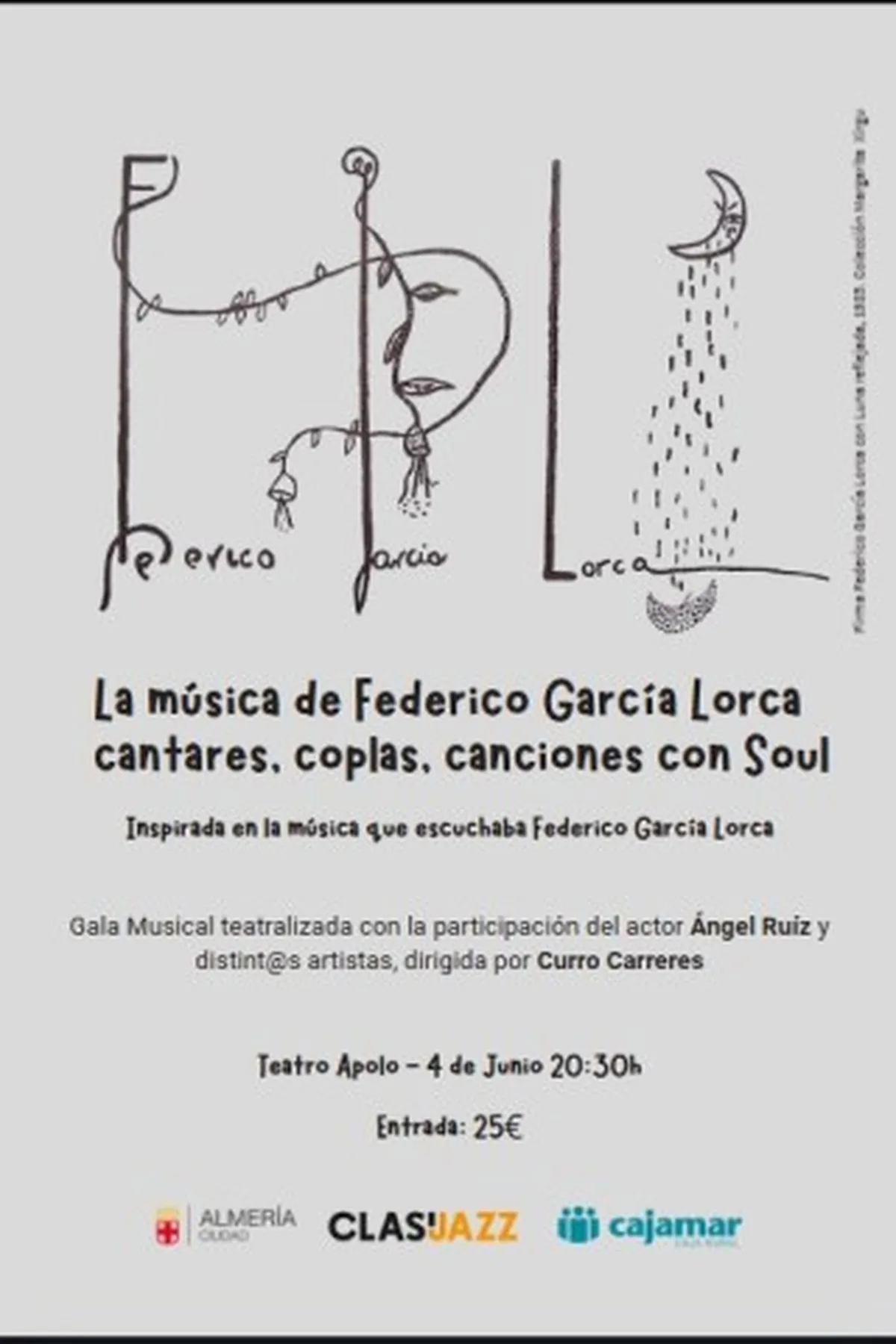 La música de Federico García Lorca: cantares, coplas, canciones con Soul. Inspirada en la música que escuchaba FGL. Un espectáculo único con el gran actor y músico Ángel Ruíz . Un lujazo sentir este espectáculo con innumerables formaciones musicales además de nuestro querido y afamado actor Ángel Ruíz , dirigido por Curro Carreres. Un noche lorquiana para dar a conocer su estancia de niño en Almería.