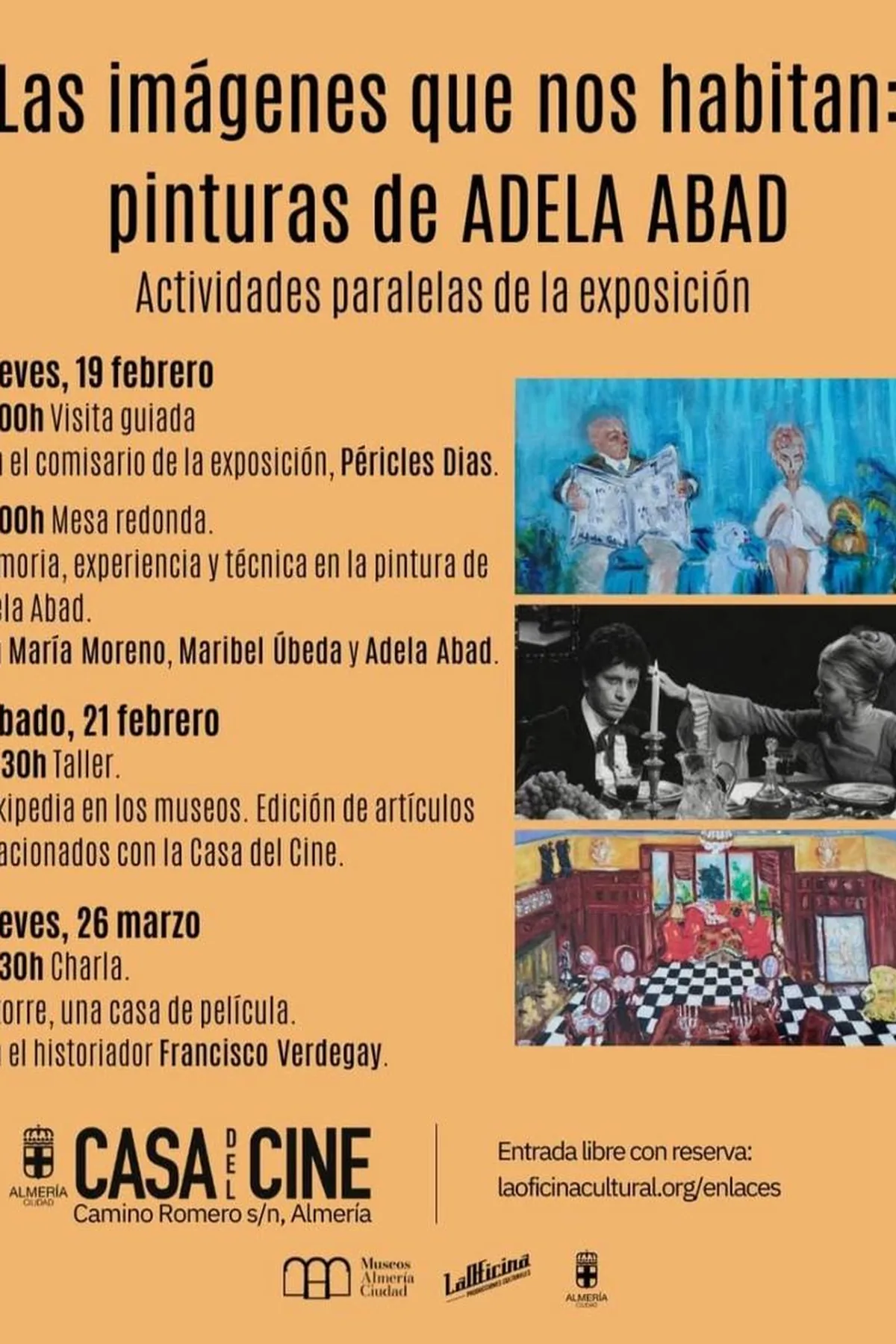 La Casa del Cine acoge actividades paralelas a la exposición ‘Las imágenes que nos habitan: pinturas de Adela Abad’. El jueves 19 de febrero habrá una visita guiada con el comisario de la exposición, Péricles Dias, a las 18:00 h, seguida de una mesa redonda sobre memoria, experiencia y técnica en la pintura de Adela Abad, con la participación de María Moreno, Maribel Úbeda y la propia Adela Abad, a las 19:00 h. El sábado 21 de febrero se impartirá un taller sobre edición de artículos en Wikipedia relacionados con la Casa del Cine, a las 10:30 h. El jueves 26 de marzo a las 18:30 h tendrá lugar una charla sobre ‘La torre, una casa de película’ con el historiador Francisco Verdegay. La entrada es libre con reserva previa en laoficinacultural.org/enlaces.