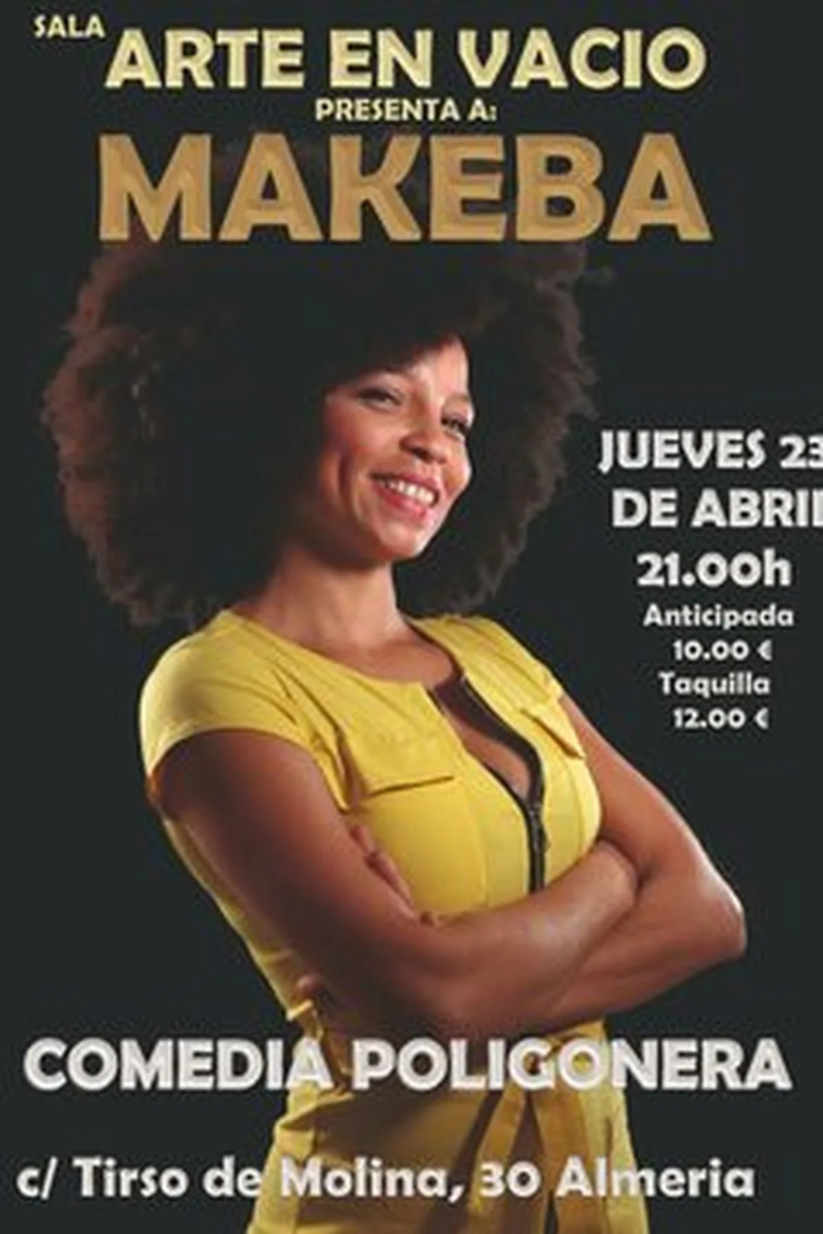 STAND UP COMEDY ARTENVACIO -MAKEBA Makeba, la nueva incursión en el mundo de la comedia, una fuerza de la naturaleza, un sinfín de risas, acreditadas por sus malabares verbales y sus piruetas literales. Procedente de un barrio definido por ''Equipo de investigación'' como uno de los más deprimidos de Europa, Makeba surge desde las profundidades para hacernos reír en la superficie. Ganadora del premio del público en el concurso de monólogos de Jumilla, y asidua a las noches de Murcia Comedy Club, donde cada día cocina y sazona un espectáculo en auge constante. APERTURA PUERTAS 20:30 COMIENZO 21:00 ENTRADAS ENTRADIUM 10€ ENTRADAS TAQUILLA 12€