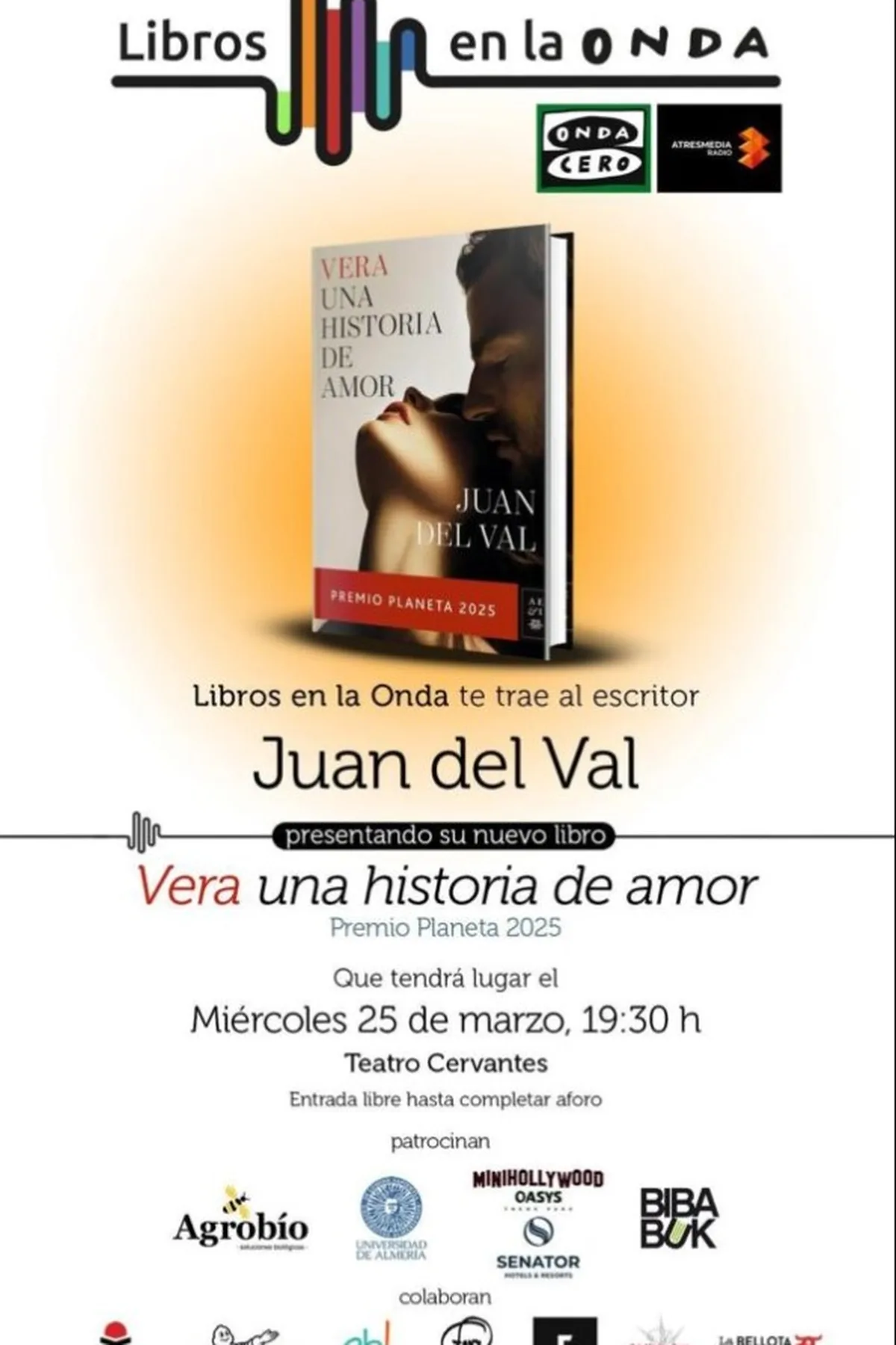 El evento ‘Libros en la Onda’ presenta la nueva obra de Juan del Val, titulada ‘Vera, una historia de amor’, galardonada con el Premio Planeta 2025. La presentación tendrá lugar el miércoles 25 de marzo a las 19:30 en el Teatro Cervantes. La entrada es libre hasta completar aforo.