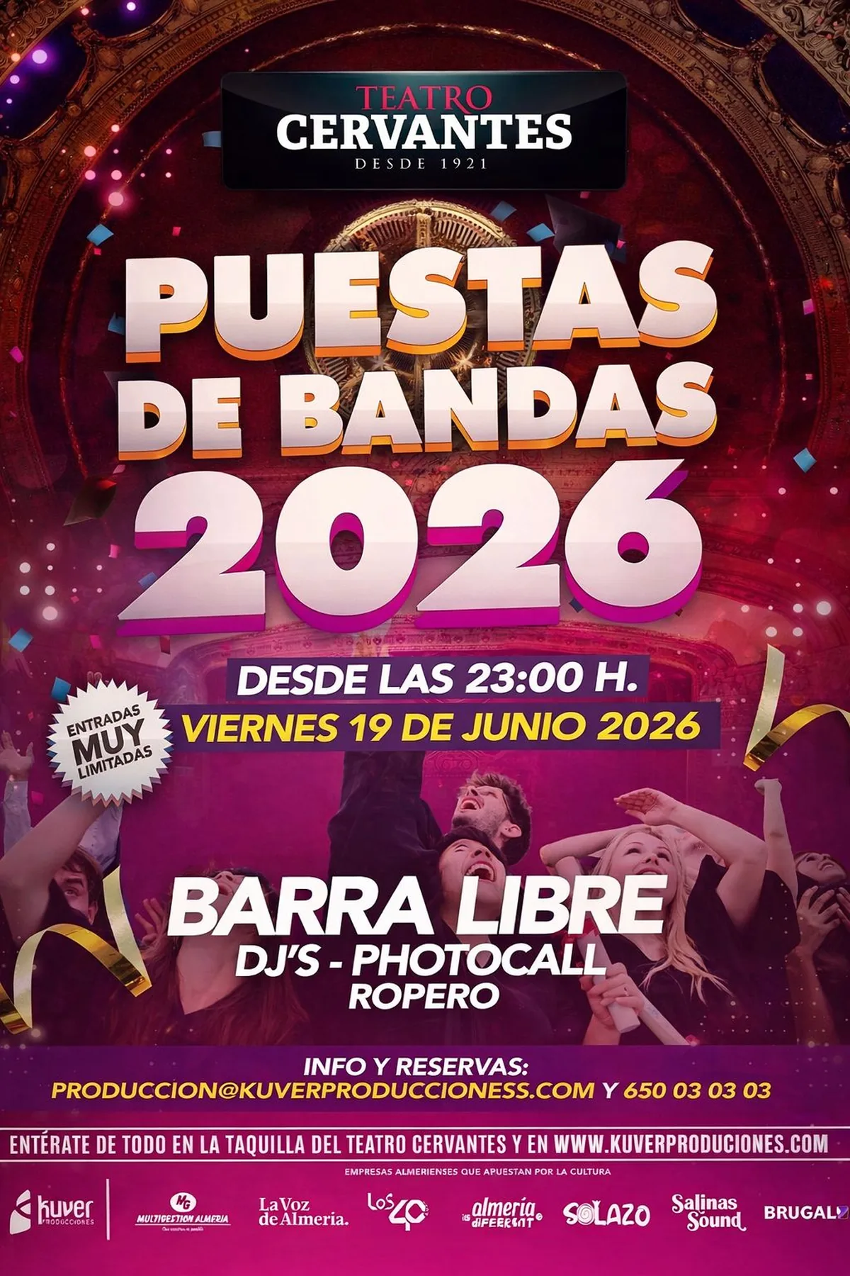 Un año más, el Teatro Cervantes abre sus puertas para recibir a los nuevos graduados.Disfruta de tu puesta de bandas con la mejor música de la mano de los mejores djs de la provincia, ropero, photocall y barra libre para brindar por tus aprobados. ¡Entradas muy limitadas!