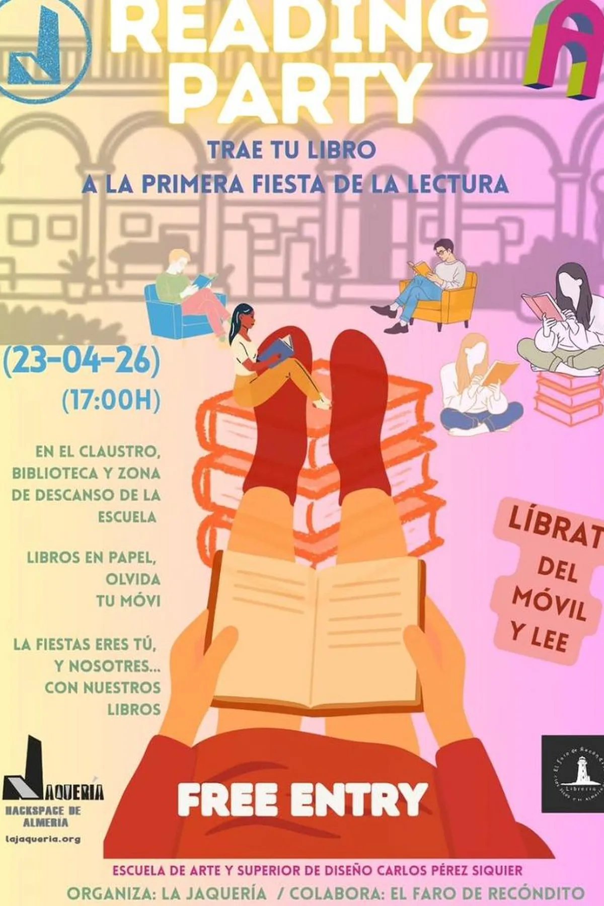 Trae tu libro a la primera fiesta de la lectura en el claustro, biblioteca y zona de descanso de la escuela. Libros en papel, olvida tu móvil. La fiesta eres tú, y nosotros… con nuestros libros. ¡Libérate del móvil y lee!