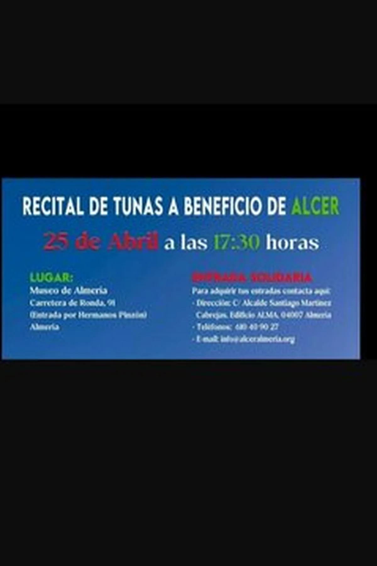 Concierto Benéfico de Tunas Te invitamos a disfrutar de una tarde muy especial llena de música, alegría y tradición con la participación de la Tuna Femenina de la UAL, la tuna Universitaria de Almería y la tuna de derecho de Almería.Un evento solidario organizado por ALCER Almería con el objetivo de seguir apoyando a las personas con enfermedad renal y sus familias. Tu asistencia suma, tu apoyo cuenta.“Si no puedes asistir, puedes colaborar con nuestra Fila 0. Tu aportación irá destinada a Alcer Almería. ¡Gracias por tu apoyo!” Lugar: Museo de Almería Hora: 17:30 Entrada solidaria¡Te esperamos para vivir una tarde única y llena de emoción!