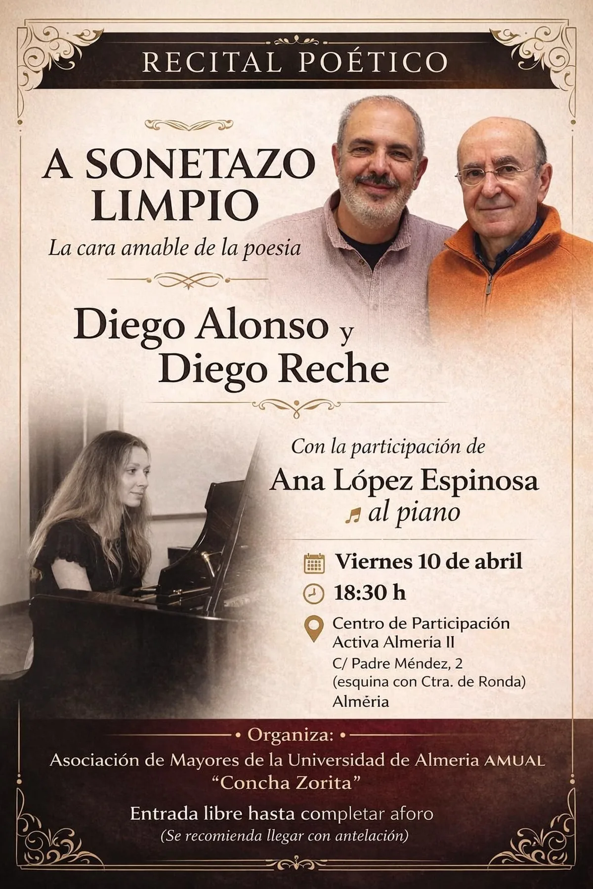 Recital poético titulado ‘A Sonetazo Limpio: La cara amable de la poesía’, presentado por Diego Alonso y Diego Reche. Con la participación especial de Ana López Espinosa al piano. El evento es organizado por la Asociación de Mayores de la Universidad de Almería AMUAL ‘Concha Zorita’. La entrada es libre hasta completar el aforo, se recomienda llegar con antelación.