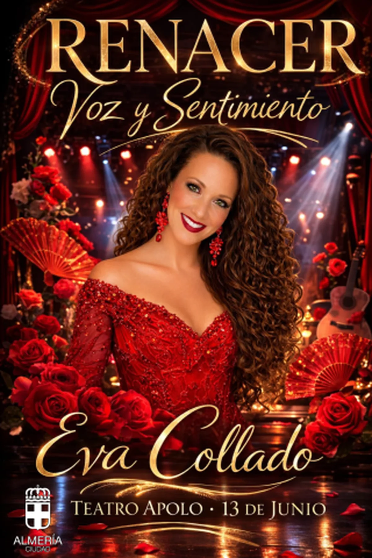 RENACER es un espectáculo que fusiona copla, flamenco y música de siempre en una propuesta escénica elegante, intensa y emocionante. Un recorrido musical donde la voz, la interpretación y la emoción conectan directamente con el público, generando una experiencia única en cada actuación. El repertorio combina grandes clásicos, versiones reconocidas y temas propios, adaptándose a distintos formatos escénicos. Eva Collado, con más de 23 años de trayectoria profesional, ha llevado la música a cada rincón de nuestra España. Ganadora del concurso Almería Novel 2013, ha participado en eventos destacados como la Noche en Blanco, la Feria de Almería, conciertos retransmitidos por Radiolé y múltiples actuaciones a nivel nacional. Su estilo se caracteriza por la fuerza interpretativa, la elegancia escénica y la capacidad de emocionar desde la verdad artística.