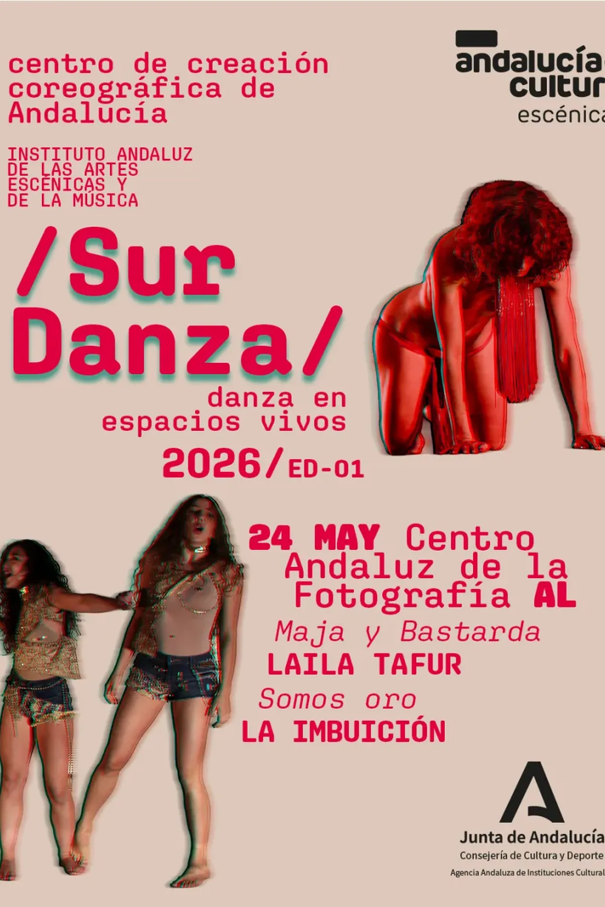 Sur Danza , ciclo orientado a expandir la exhibición a espacios no escénicos En el Centro Andaluz de la Fotografía , Laila Tafur viaja del tablao al teatro, de la cueva al cabaret, de lo sobrio a la fiesta con Maja y Bastarda ; y la compañía La Imbuición estudia el poder y el contrapoder de la belleza, la sexualidad y la vitalidad de la juventud en SOMOS ORO . 12.00 Maja y Bastarda es una apropiación de los bailes que son poco serios, poco sobrios, poco puros. Es una elección lúcida por los bailes que otros decidieron que eran poco. De esta manera alzo a la mil leches, que haciendo gala de su engranaje ficticio entre lo tradicional y lo novedoso, fabrica una jonda bastarda, una folklórica frankenstein que viaja del tablao al teatro, de la cueva al cabaret, del gremio a la afición o de lo sobrio a la fiesta. 12.30 En Somos Oro las artistas exploran la necesidad de trascender, el impacto de ser vistas y la muerte como posibilidad anticipada. Se analiza la juventud y se cuestiona todo lo que conlleva —la belleza, la sexualidad, la vitalidad— para así desarrollar un estudio sobre la feminidad y sus consecuencias a nivel societal y corporal.