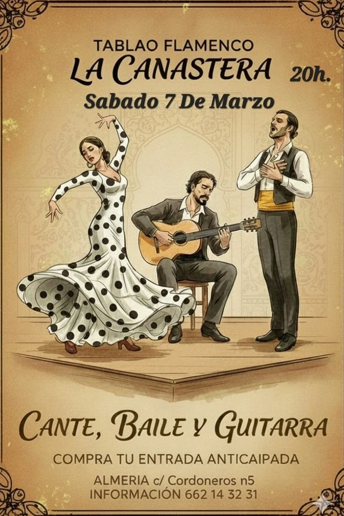 Disfruta de una noche mágica de flamenco con el espectáculo de La Canastera. Este evento contará con cante, baile y guitarra en vivo, sumergiéndote en la auténtica tradición flamenca. ¡Compra tu entrada anticipada y vive una experiencia inolvidable!
