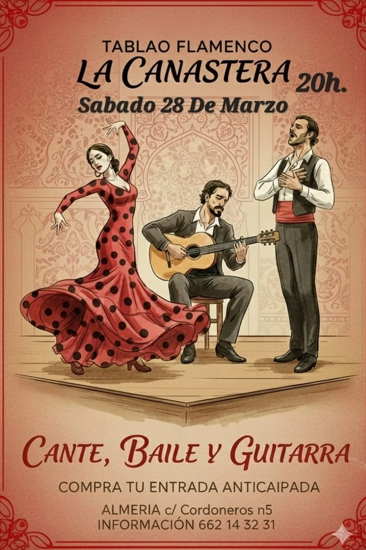Disfruta de una noche inolvidable con el mejor flamenco en vivo en el Tablao Flamenco La Canastera. Cante, baile y guitarra se unen para ofrecerte una experiencia auténtica y vibrante el sábado 28 de marzo a las 20:00. Compra tu entrada anticipada y no te pierdas esta celebración del arte flamenco en el corazón de Almería.