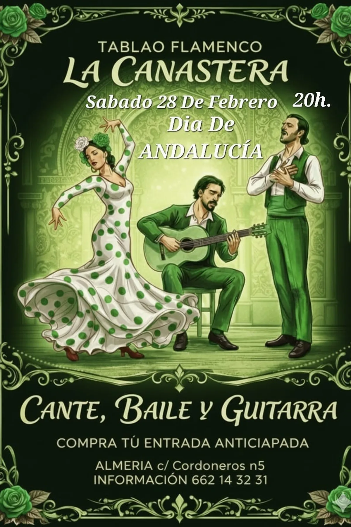 Tablao Flamenco La Canastera Almería se encuentra en el corazón del antiguo barrio de “La Chanca Pescadería”, entre el puerto pesquero y el puerto de los cruceros. Esta zona siempre ha sido conocida por su amor al flamenco. Allí, entre las redes y los barquitos, nace el arte vivo y puro, y “La Canastera” lo lleva al escenario, con respeto y ternura.. Los residentes artísticos del Tablao Flamenco La Canastera Almería son tanto bailaores, cantaores y guitarristas de renombre, cómo jóvenes talentos. En esta sala, íntima y original, se cree un ambiente cálido, familiar y lleno de pasión. El elenco del tablao procura preservar las tradiciones del flamenco viéndolo cómo una llave a los sentimientos más profundos, y trasmitir estas emociones al público.. En el Tablao Flamenco La Canastera Almería, se puede disfrutar de un espectáculo en directo desde muy cerca. Igual se puede completar esta intensa experiencia con una copa de vino o cerveza para combatir el calor que provoca el nervio del flamenco, cuando en la penumbra del escenario se desarrolla el espectáculo que mueve el alma.