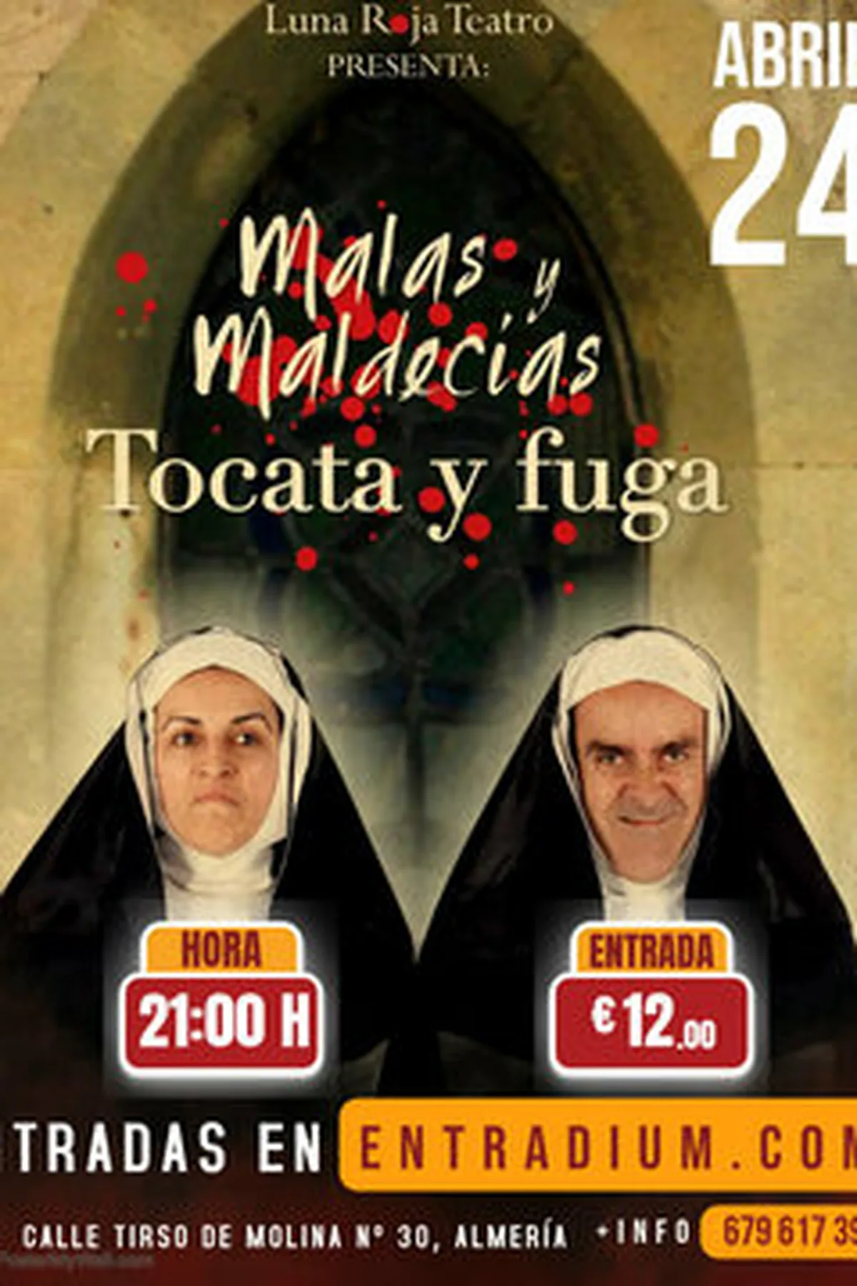 TEATRO DE COMEDIA - MALAS & MALDECIAS TOCATA Y FUGA¡COMEDIA! “MALAS Y MALDECÍAS TOCATA Y FUGA”, segunda entrega de las desventuras de las arpías Balbina y María José, que vuelven a las andanzas en una historia donde serán capaces de convertir la vida de un plácido convento benedictino en el atrio del infierno. Su perversión no solo sigue intacta, sino que avanza en el disparate loco de la maldad por la maldad, sin respeto a lo sagrado y con la moralidad sepultada desde que su madre las trajo al mundo. Una trama misteriosa, ácida, oscura y muy divertida protagonizada por Fernando Labordeta Blanco y Dita Ruiz Actress. Texto y dirección de Antonio De La Trinidad RuizApertura de puertas a las: 20:30 hEspectáculo a las: 21:00 hEntradas en Entradium: 12€Entradas en puerta: 12€