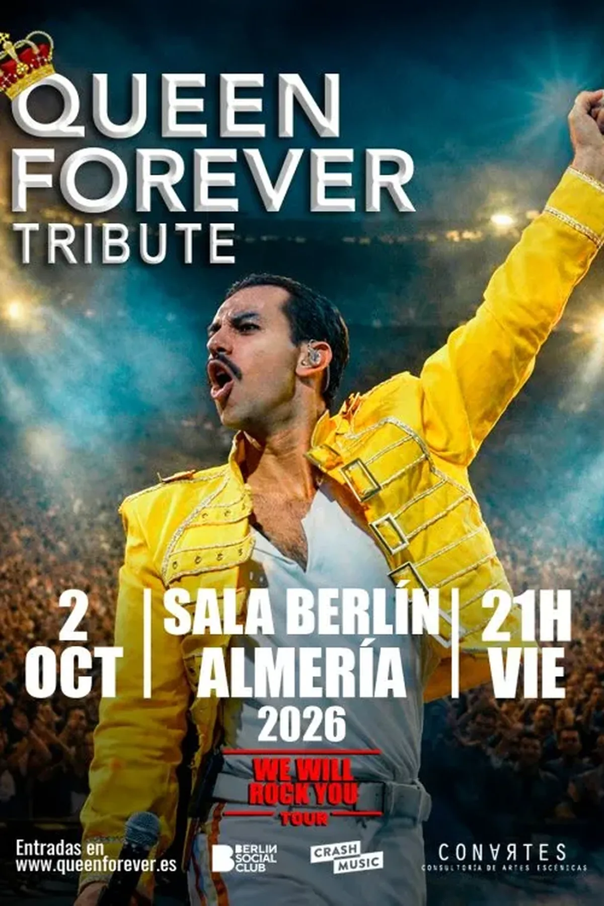 CONCIERTO TRIBUTO QUEEN FOREVER- ALMERÍA - SALA BERLIN SOCIAL CLUB - VIERNES 2 DE OCTUBRE 2 de Octubre de 2026 Apertura 20:00 Inicio 21:00 Berlín Social Club - Parque de Nicolás Salmerón, 9, 04002 Almería, España