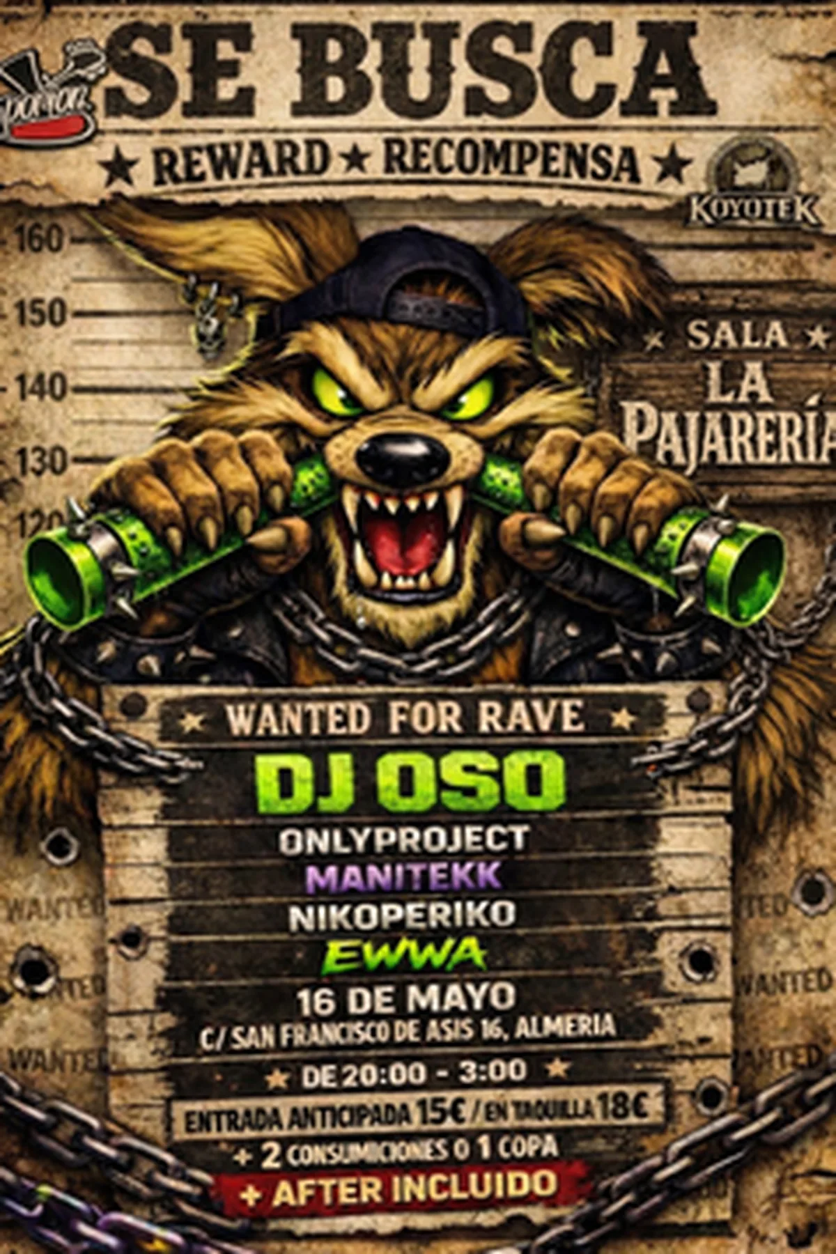 Tenemos ya disponible las entradas de nuestra gran fiesta KoYoTeK en Almería capital la sala La Pajarería con after incluido.En esta gran fiesta tenemos de cabeza de cartel a uno de los grandes de masía, un gran referente de muchos, unos de los más bestias de los pitos y un salvaje en la escena…El gran Dj Oso También en esta gran fiesta contaremos con otros 4 dj’s más que reventarán la sala con sus sonidos más profundos y más intensos, en insta tenéis a los demás dj’s!! ig: @koyotek_collectiveAsí que no os lo penséis dos veces y venir a pasar una gran noche y fiesta única en Almería.